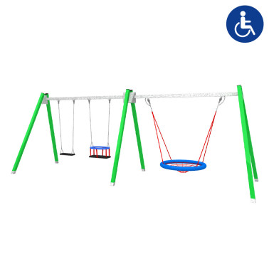 Altalena in serie composta da tre diverse sedute: una tavoletta, un cestello e un cestone, ideali per offrire un'esperienza di gioco variegata a bambini di differenti età. La struttura, pensata per l’uso in aree gioco pubbliche, è realizzata in legno lamellare di pino trattato in autoclave con sali atossici e acciaio verniciato con polveri epossidiche per garantire massima resistenza agli agenti atmosferici. La configurazione in serie consente a più bambini di giocare simultaneamente in sicurezza. I materiali utilizzati e le soluzioni costruttive adottate rispettano pienamente la norma UNI EN 1176.