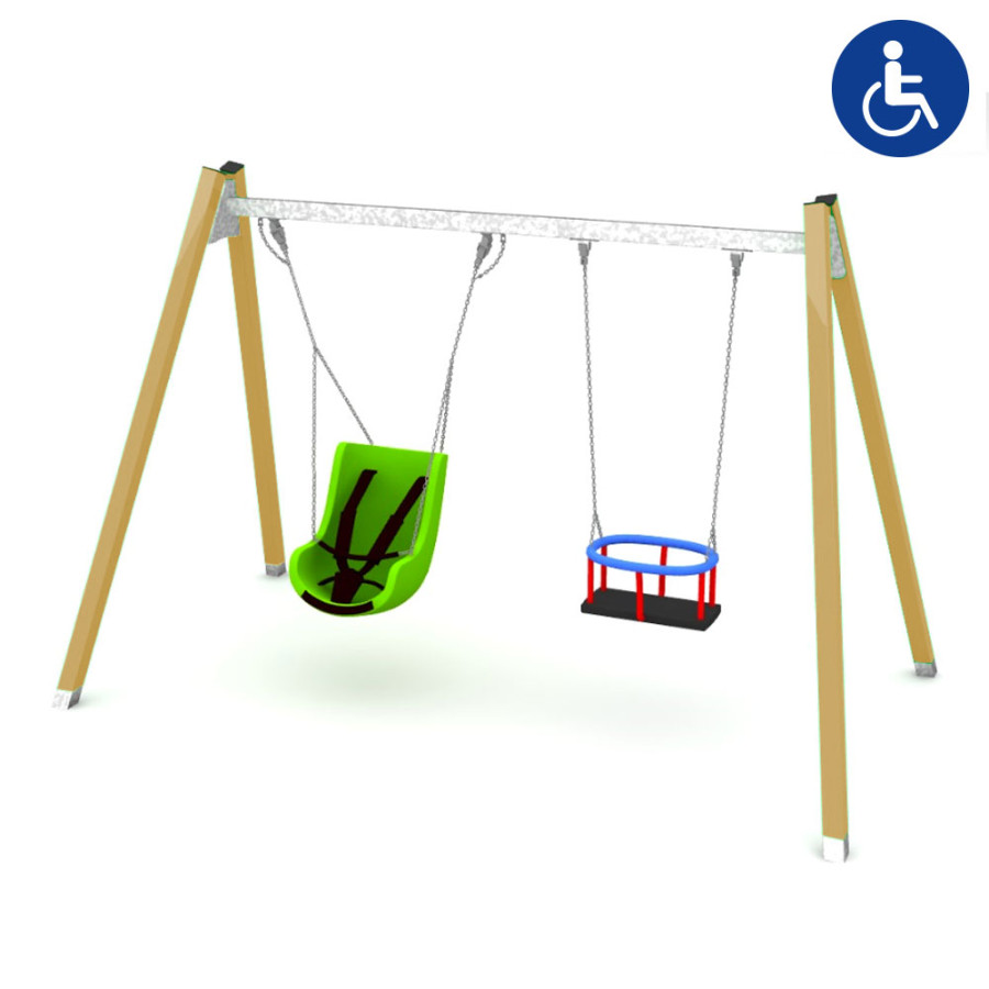 Altalena inclusiva doppia pensata per favorire il divertimento di tutti i bambini, comprese le persone con disabilità. La struttura è realizzata con materiali robusti e resistenti agli agenti atmosferici. Presenta due sedute differenti per adattarsi a varie esigenze: