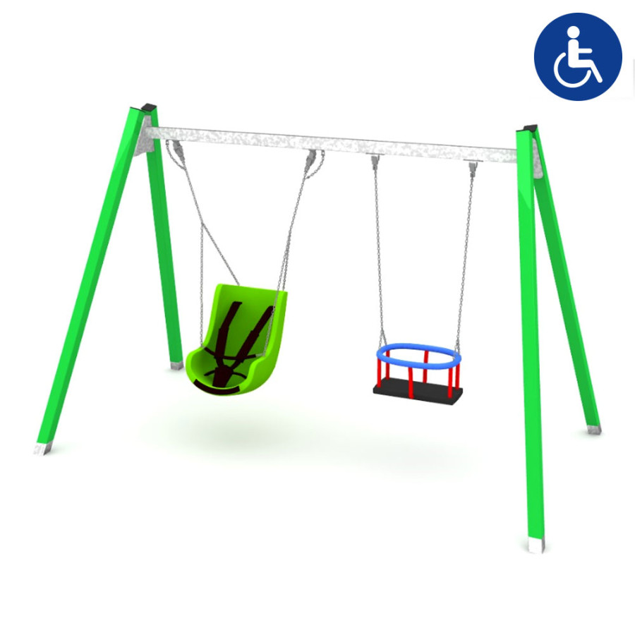Altalena inclusiva doppia progettata per garantire il gioco a bambini con e senza disabilità. La struttura in metallo verniciato è resistente agli agenti atmosferici e adatta all'uso in aree pubbliche e scolastiche. I due sedili permettono di soddisfare diverse esigenze di sicurezza e comfort: