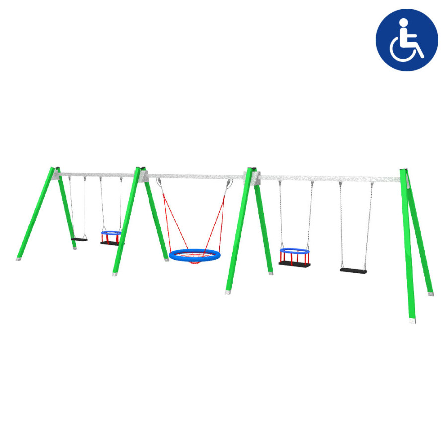 Altalena multipla di grandi dimensioni, completa di 5 postazioni: 1 cestone, 2 tavolette e 2 cestelli. Progettata per parchi pubblici, aree gioco scolastiche e ambienti ricreativi, consente il gioco simultaneo di più bambini in totale sicurezza. Realizzata con materiali certificati e resistenti alle intemperie.