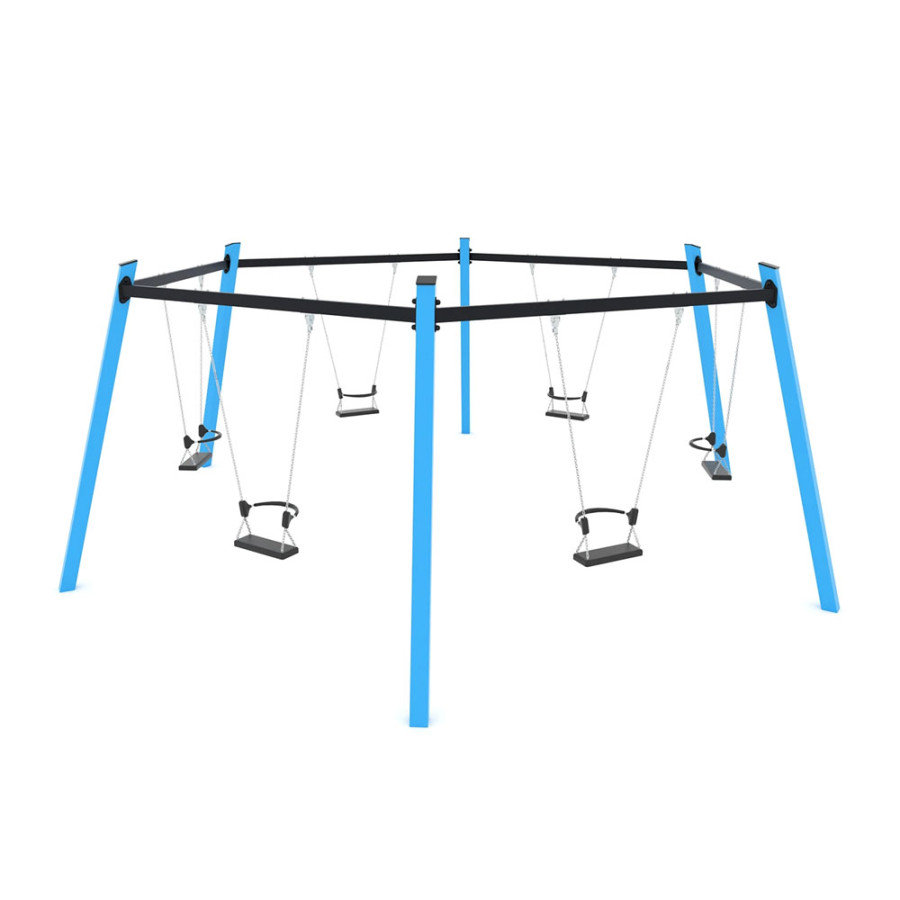 Altalena modulare a sei postazioni con configurazione esagonale, progettata per offrire un’esperienza di gioco sicura, coinvolgente e condivisa. La struttura in acciaio trattato anticorrosione garantisce durata e resistenza in qualsiasi condizione climatica, rendendola ideale per installazioni permanenti in spazi pubblici e parchi gioco.