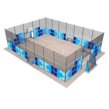 ARENA MULTISPORT B RECINZIONE ALTA. Conforme alla NORMA UNI EN 15312. Struttura composta da elementi in acciaio inox zincato e verniciato con polvere epossidica. Pannelli realizzati in acciaio zincato e lastre in resistente HDPE in composto riciclato, resistente alla corrosione, all’umidità e alle basse temperature. Struttura realizzata senza spigoli vivi o fessure che potrebbero rappresentare un pericolo per la testa, le dita o qualsiasi altra parte del corpo. Dispone di due porte da calcio in acciaio zincato a caldo, due tabelloni da basket. Installazione e ancoraggio su superfici piane e ben trattate.