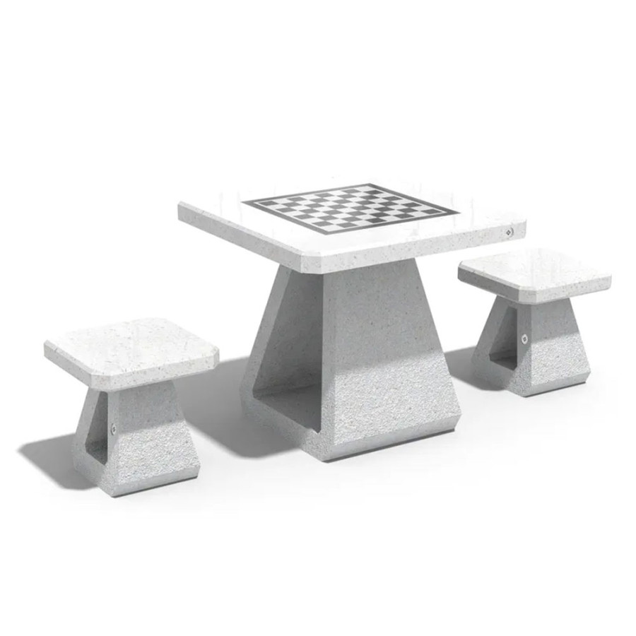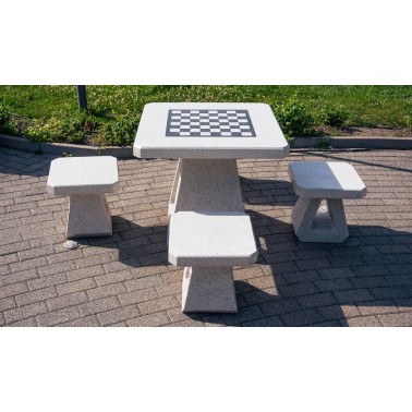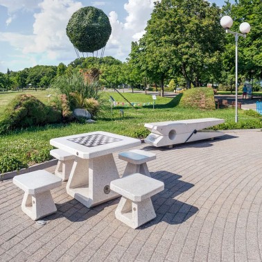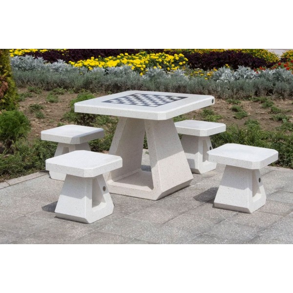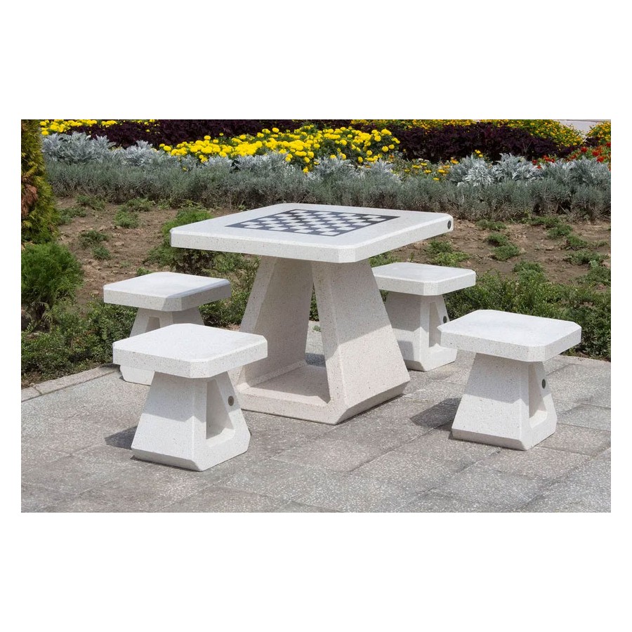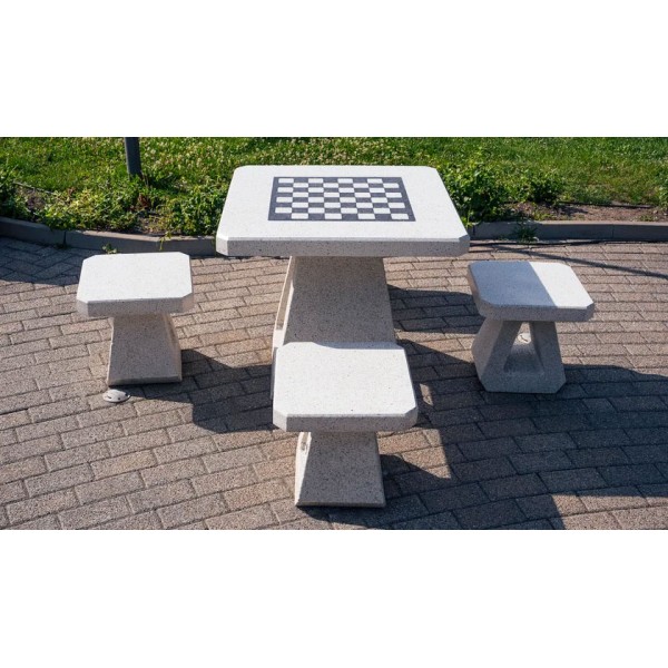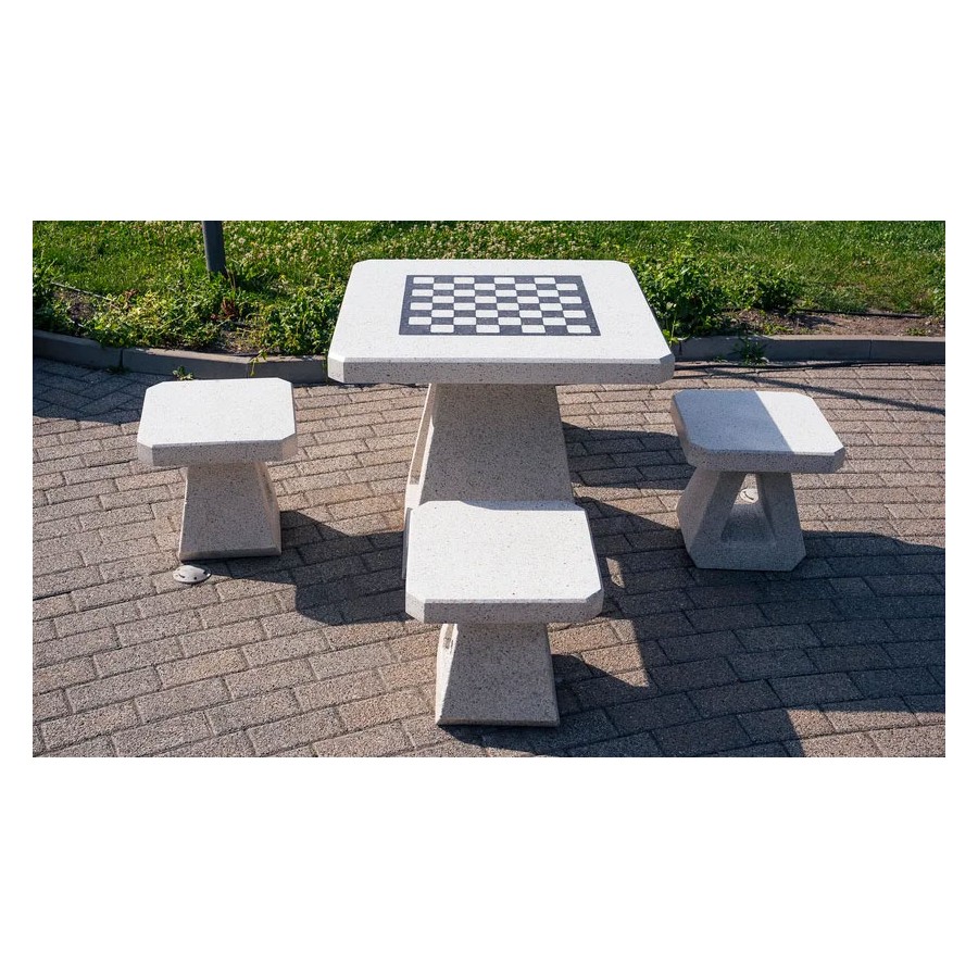 Il tavolo da gioco è realizzato in calcestruzzo fibrorinforzato ad alte prestazioni con aggregato naturale in marmi naturali o pietre di granito in diverse combinazioni di colori e piano lucido. Gli elementi in calcestruzzo sono trattati con un rivestimento protettivo laccato che migliora la resistenza alle condizioni atmosferiche e riduce la deposizione di sporco. I giochi disponibili includono scacchi, dama e backgammon.