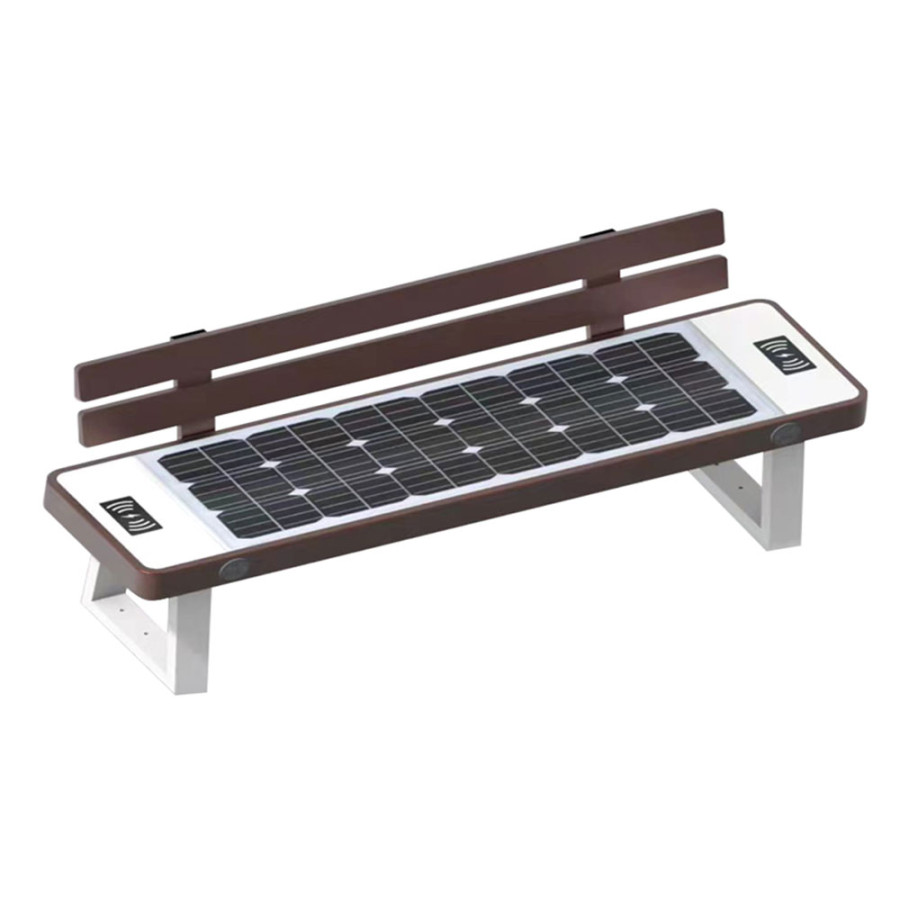 Panchina smart con struttura in alluminio, ideale per parchi, strutture ricettive, ricreative e sportive. Adatta all'ambiente esterno, è provvista di un pannello solare che alimenta una batteria che consente la ricarica di smartphone, tablet, sigarette elettroniche e dispositivi mobili.
