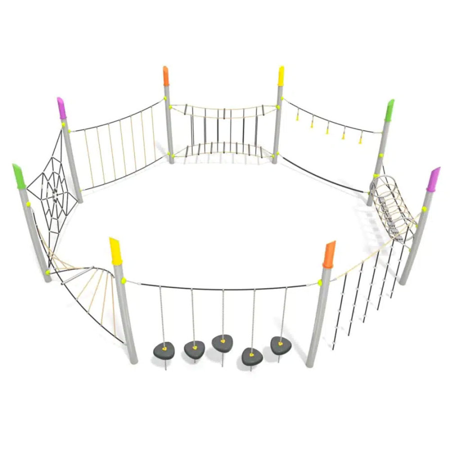 Struttura da gioco costituita da diversi moduli che stimolano le attività psicofisiche e la socializzazione tra bambini. Conforme alla Norma UNI EN 1176.