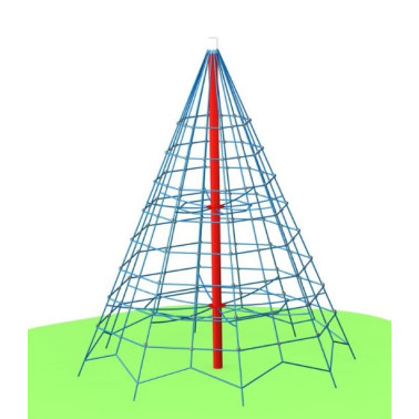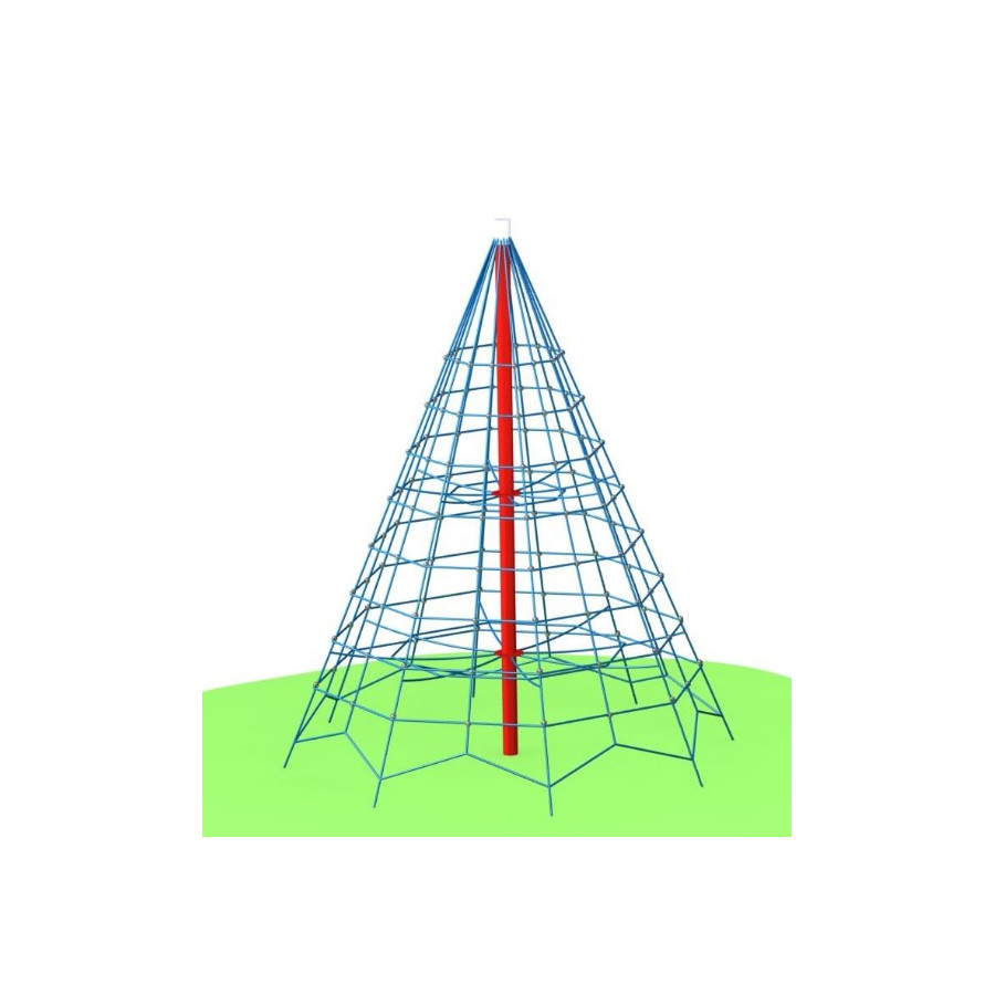 Piramide arrampicata a rete. Conforme alla NORMA UNI EN 1176-1. Palo centrale in acciaio verniciato, la rete è composta da funi in acciaio multifilo rivestite da trecce in nylon, fissate da raccordi in acciaio e bloccacorda in alluminio.
