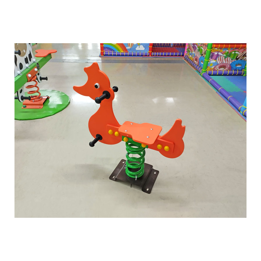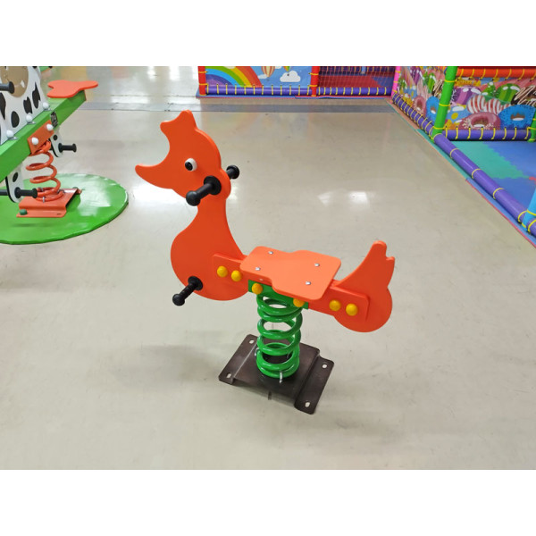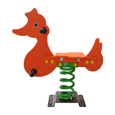 Gioco a molla paperina lux conforme alla Norma UNI EN 1176. Struttura a sagoma di paperina, adatta all’ambiente esterno con possibilità di ancoraggio sia su massetto in c.a che su terreno o prato naturale. Realizzata in polietilene ad alta densità (HDPE) completamente riciclabile dello spessore di mm 15, pantografato e colorato in massa, dotata di maniglie e poggiapiedi in gomma antiscivolo con anima in acciaio. Fissata su molla di diametro Ø 150 mm e altezza di 330 mm in acciaio verniciata a forno 180° con polvere epossidica, omologata e completa di dispositivo anti schiacciamento dita.