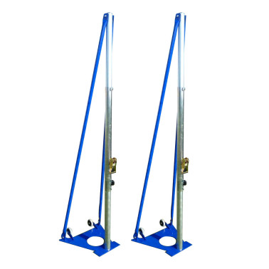 Impianto da pallavolo a traliccio per uso tennis, modello da competizione. Struttura composta da montante centrale in tubo rotondo Ø 70 mm in acciaio zincato, ancorato su ampia piastra di appoggio con fori per il fissaggio a terra tramite tasselli. Tiranti in tubolare di acciaio verniciato Ø 40 mm, dotati di ruote per facilitarne il trasporto. Regolazione dell'altezza della rete mediante scorrevoli zincati. Completo di tendirete.